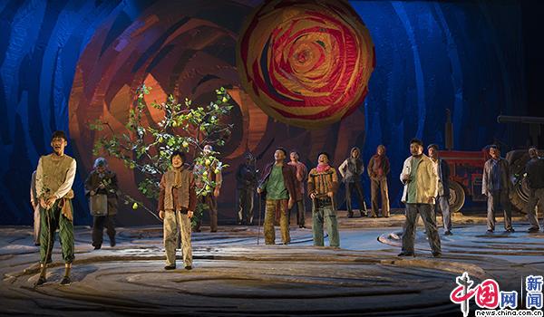 此外,通过旋转舞台和多彩光影呈现出的视觉效果,带给观众耳目一新的体验感,更加体现出青春的朝气与活力。作曲胡笑源为《村里新来的年轻人》创作的西北民谣穿插在剧情之中,恰如其分地交代了环境背景以及人物心理活动,为推进剧情起到了推波助澜的作用。
