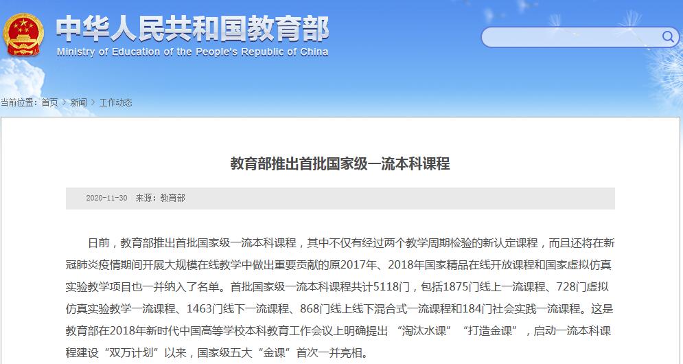 中国网11月30日讯 据教育部网站今日消息,日前,教育部推出首批国家级一流本科课程,其中不仅有经过两个教学周期检验的新认定课程,而且还将在新冠肺炎疫情期间开展大规模在线教学中做出重要贡献的原2017年、2018年国家精品在线开放课程和国家虚拟仿真实验教学项目也一并纳入了名单。
