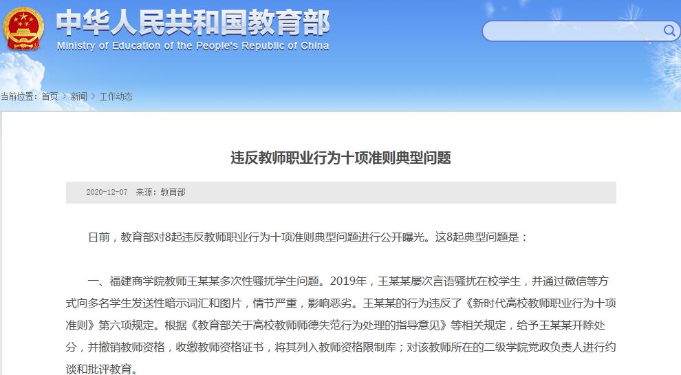 一、福建商学院教师王某某多次性骚扰学生问题。2019年,王某某屡次言语骚扰在校学生,并通过微信等方式向多名学生发送性暗示词汇和图片,情节严重,影响恶劣。王某某的行为违反了《新时代高校教师职业行为十项准则》第六项规定。根据《教育部关于高校教师师德失范行为处理的指导意见》等相关规定,给予王某某开除处分,并撤销教师资格,收缴教师资格证书,将其列入教师资格限制库;对该教师所在的二级学院党政负责人进行约谈和批评教育。