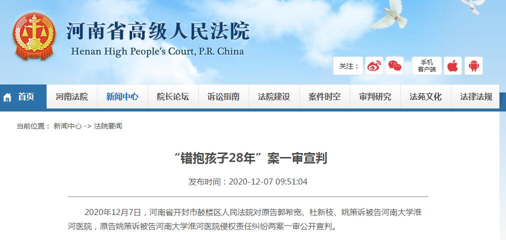 中国网12月7日讯 据河南省高级人民法院网站消息,2020年12月7日,河南省开封市鼓楼区人民法院对原告郭希宽、杜新枝、姚策诉被告河南大学淮河医院,原告姚策诉被告河南大学淮河医院侵权责任纠纷两案一审公开宣判。