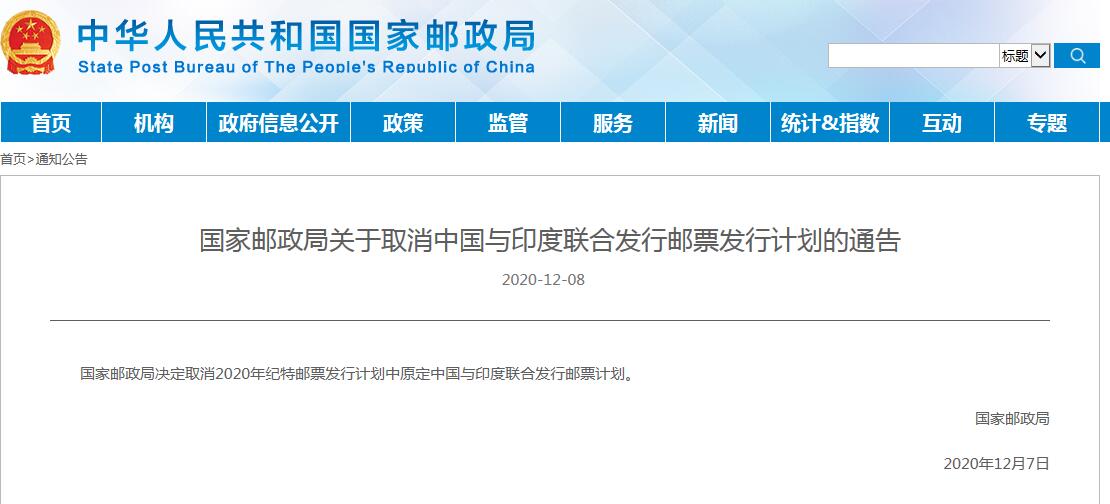 中国网12月8日讯 据国家邮政局网站今日消息,国家邮政局发布《国家邮政局关于取消中国与印度联合发行邮票发行计划的通告》,《通告》称,国家邮政局决定取消2020年纪特邮票发行计划中原定中国与印度联合发行邮票计划。