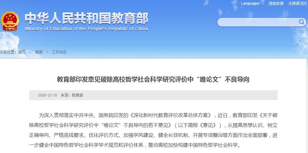 中国网12月15日讯 据教育部网站今日消息,为深入贯彻落实中共中央、国务院印发的《深化新时代教育评价改革总体方案》,近日,教育部印发《关于破除高校哲学社会科学研究评价中“唯论文”不良导向的若干意见》(以下简称《意见》)。《意见》称,不得把SSCI、CSSCI等论文收录数作为教师招聘、职务(职称)评聘、人才引进的前置条件和直接依据。