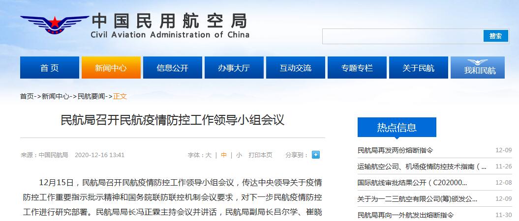 12月15日,民航局召开民航疫情防控工作领导小组会议,传达中央领导关于疫情防控工作重要指示批示精神和国务院联防联控机制会议要求,对下一步民航疫情防控工作进行研究部署。民航局局长冯正霖主持会议并讲话。