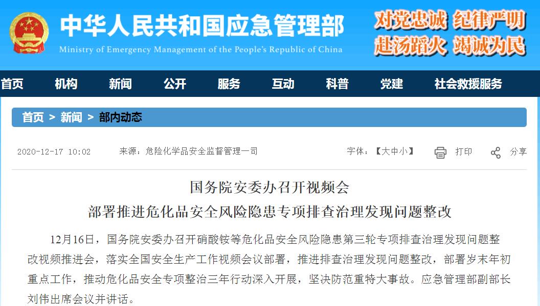 中国网12月17日讯 据应急管理部网站今日消息,12月16日,国务院安委办召开硝酸铵等危化品安全风险隐患第三轮专项排查治理发现问题整改视频推进会,落实全国安全生产工作视频会议部署,推进排查治理发现问题整改,部署岁末年初重点工作,推动危化品安全专项整治三年行动深入开展,坚决防范重特大事故。
