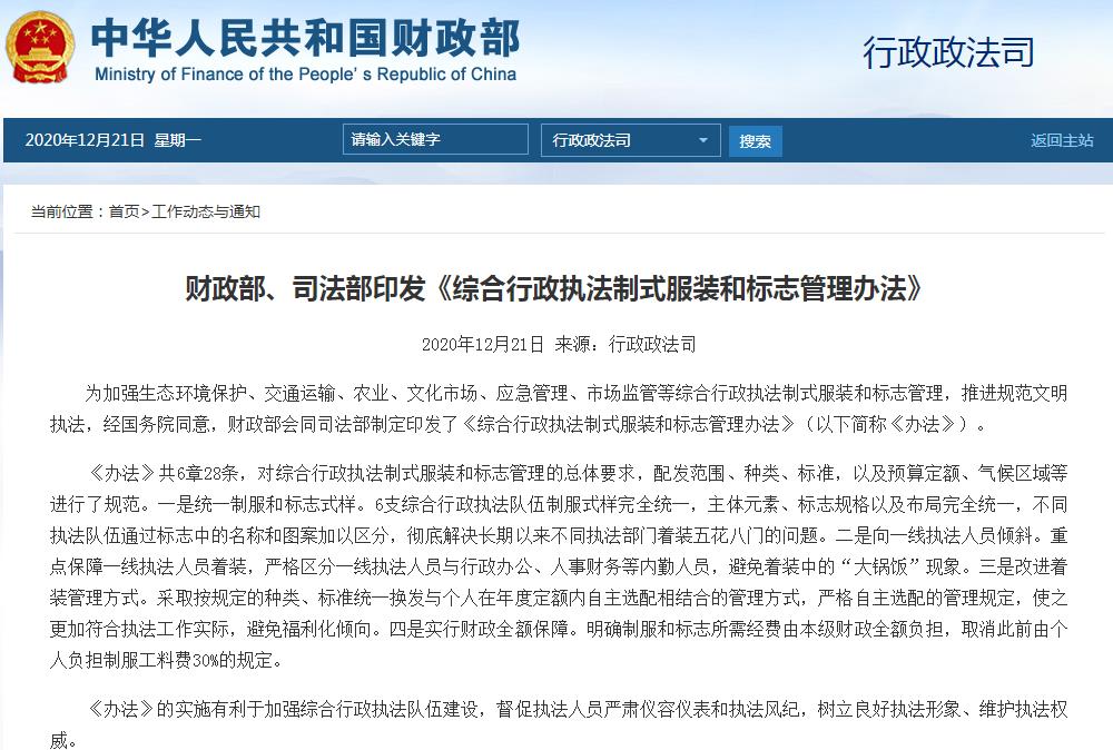 中国网12月21日讯 据财政部网站今日消息,为加强生态环境保护、交通运输、农业、文化市场、应急管理、市场监管等综合行政执法制式服装和标志管理,推进规范文明执法,经国务院同意,财政部会同司法部制定印发了《综合行政执法制式服装和标志管理办法》(以下简称《办法》)。