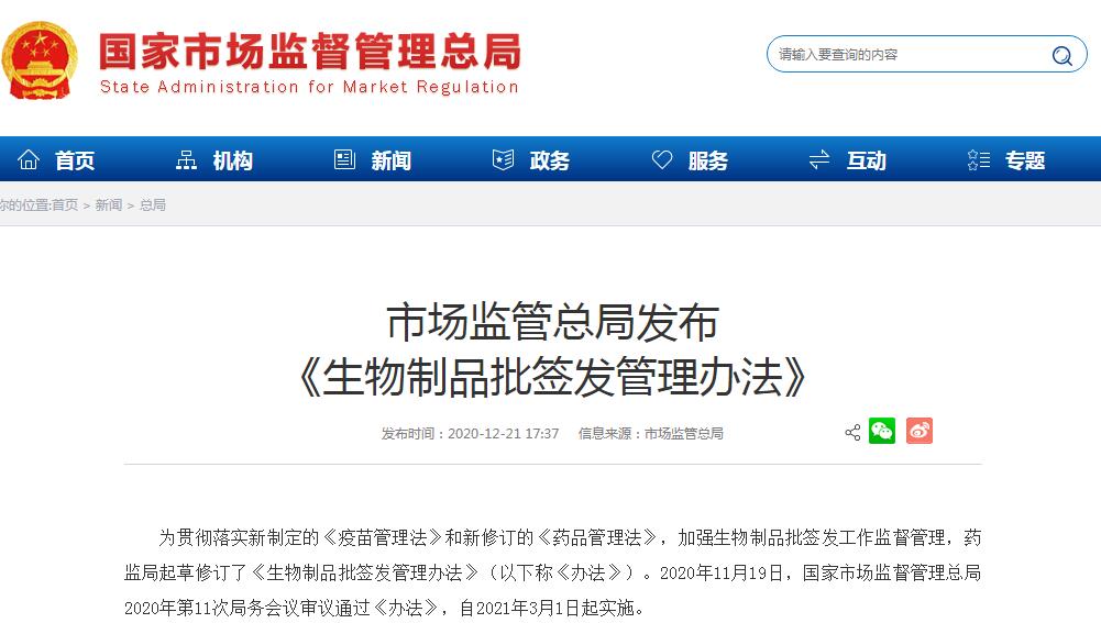 中国网12月22日讯 据国家市场监督管理总局网站21日消息,为贯彻落实新制定的《疫苗管理法》和新修订的《药品管理法》,加强生物制品批签发工作监督管理,药监局起草修订了《生物制品批签发管理办法》(以下称《办法》)。2020年11月19日,国家市场监督管理总局2020年第11次局务会议审议通过《办法》,自2021年3月1日起实施。