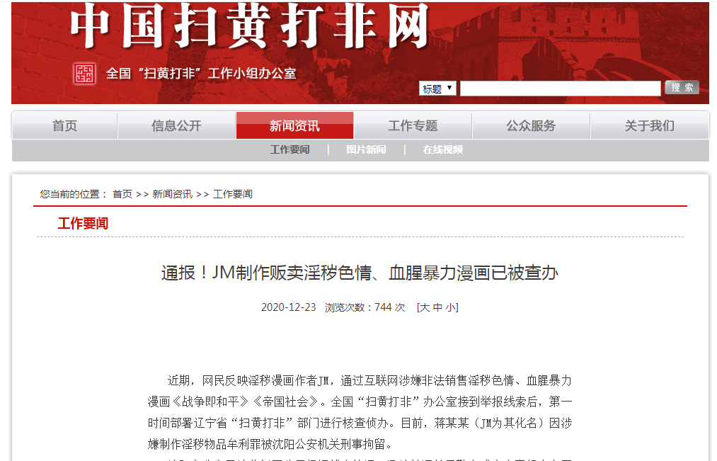 中国网12月24日讯 全国“扫黄打非”工作小组办公室官网昨日(23日)通报,根据网民反映淫秽漫画作者JM,通过互联网涉嫌非法销售淫秽色情、血腥暴力漫画《战争即和平》《帝国社会》。全国“扫黄打非”办公室接到举报线索后,第一时间部署辽宁省“扫黄打非”部门进行核查侦办。目前,蒋某某(JM为其化名)因涉嫌制作淫秽物品牟利罪被沈阳公安机关刑事拘留。