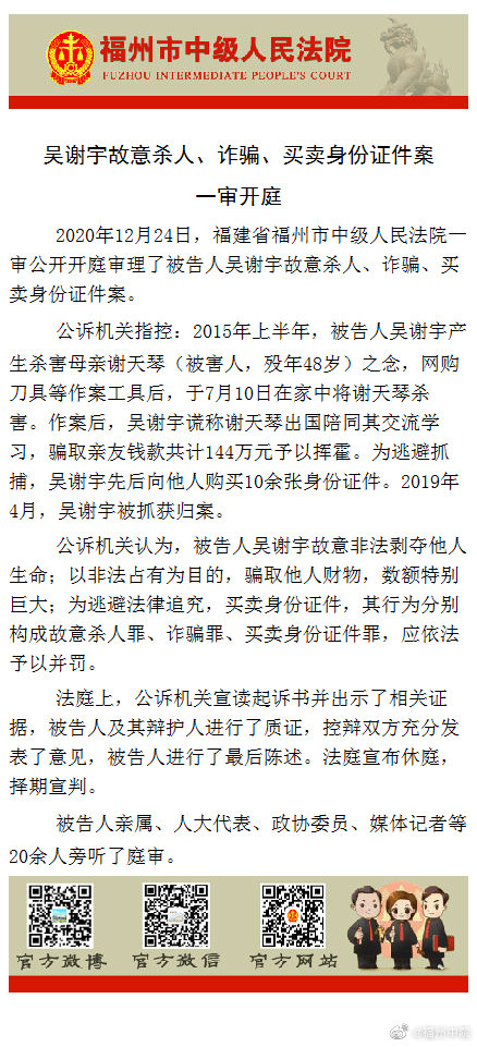 中国网12月24日讯 据福建省福州市中级人民法院官方微博消息,2020年12月24日,福建省福州市中级人民法院一审公开开庭审理了被告人吴谢宇故意杀人、诈骗、买卖身份证件案。