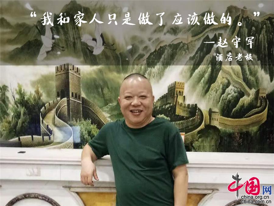 “60后”赵守军是湖北荆州人,在武汉经营一家酒店。疫情发生时,他和员工们正在老家过年。因为酒店紧邻武汉客厅方舱医院,赵守军先后接到一线抗疫医生、警官打来的电话,询问能否入住。