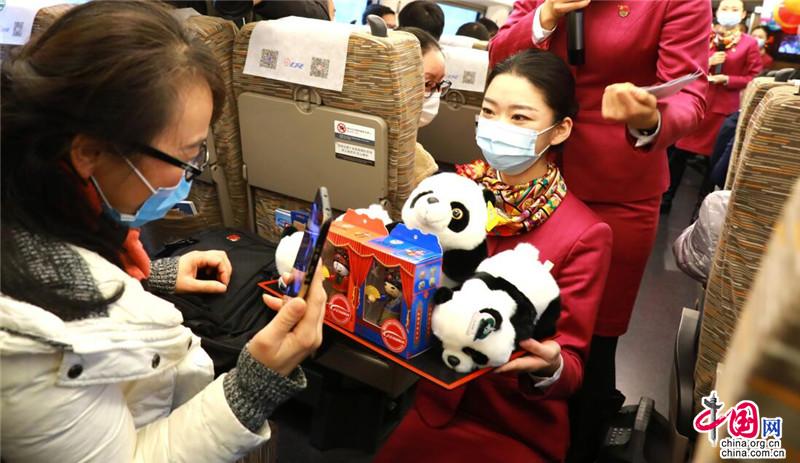 12月24日,在成都东开往沙坪坝的G8607次复兴号动车组上,一位参与游戏获胜的旅客正在挑选纪念品。