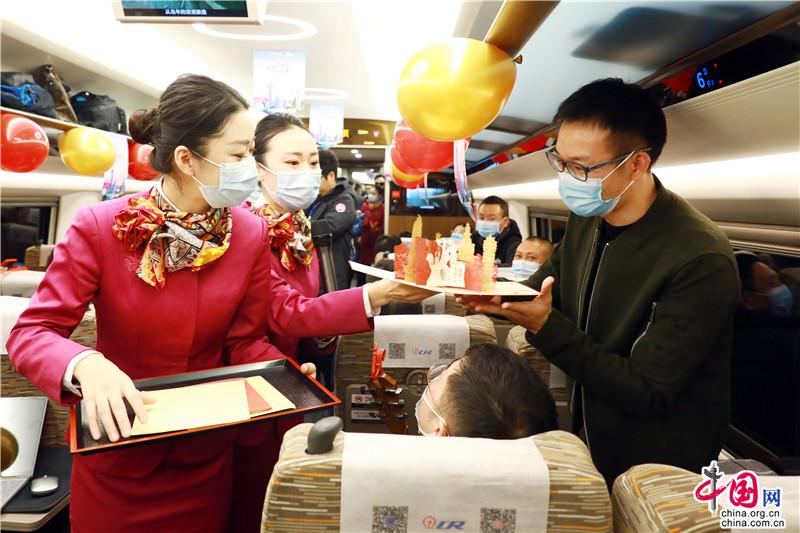 12月24日,在成都东开往沙坪坝的G8607次复兴号动车组上,成都客运段的乘务员正在将立体剪纸作为纪念品赠送给乘车旅客。龚萱 摄