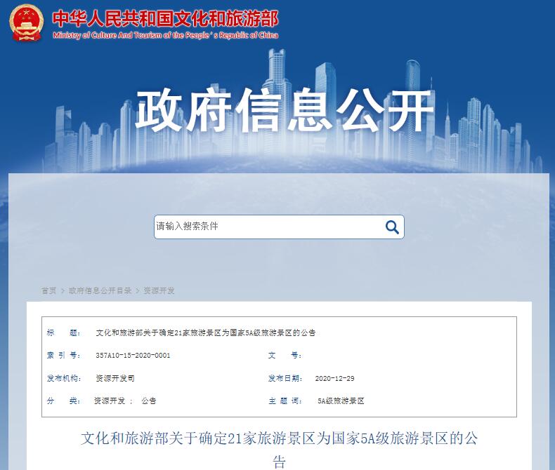 文旅部表示,依照中华人民共和国国家标准《旅游景区质量等级的划分与评定》与《旅游景区质量等级管理办法》,经有关省(区、市)文化和旅游行政部门推荐,文化和旅游部按程序组织综合评定并于2020年12月25日完成公示,确定21家旅游景区为国家5A级旅游景区。