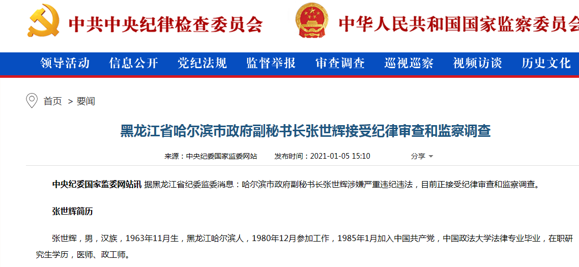 中国网1月5日讯 据中央纪委国家监委网站今日消息,哈尔滨市政府副秘书长张世辉涉嫌严重违纪违法,目前正接受纪律审查和监察调查。