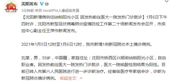 中国网1月6日讯 据中共沈阳市委宣传部官方微博消息,1月6日下午,沈阳市新型冠状病毒肺炎疫情防控工作第二十场新闻发布会召开,沈阳市疾控中心副主任王萍介绍,2021年1月5日12时至1月6日12时,沈阳市新增1例新冠肺炎本土确诊病例。