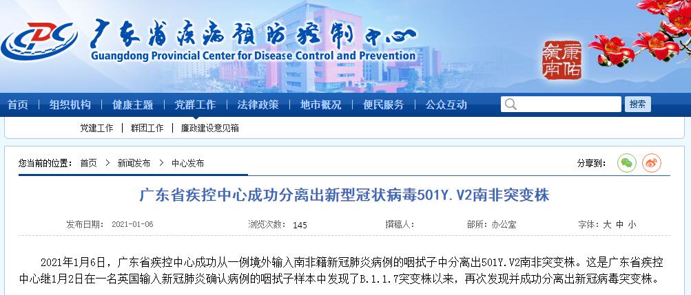 中国网1月6日讯 据广东省疾控中心网站消息,广东省疾控中心今日成功从一例境外输入南非籍新冠肺炎病例的咽拭子中分离出501Y.V2南非突变株。这是广东省疾控中心继1月2日在一名英国输入新冠肺炎确认病例的咽拭子样本中发现了B.1.1.7突变株以来,再次发现并成功分离出新冠病毒突变株。