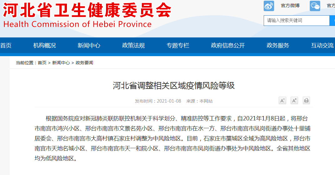 之前,石家庄市藁城区全域为高风险地区,邢台市南宫市天地名城小区、邢台市南宫市天一和院小区、邢台市南宫市凤岗街道办事处为中风险地区。全省其他地区均为低风险地区。
