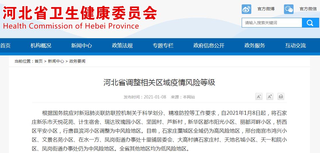 中国网1月8日讯 据河北省卫生健康委员会网站今日消息,根据国务院应对新冠肺炎联防联控机制关于科学划分、精准防控等工作要求,自2021年1月8日起,将石家庄新乐市天悦花苑、计生宿舍、瑞达玫瑰园小区、坚固村、芦新村,新华区都市阳光小区、丽都河畔小区,桥西区平安小区,行唐县滨河小区调整为中风险地区。目前,石家庄藁城区全域仍为高风险地区,邢台南宫市鸿兴小区、文景名苑小区、在水一方、凤岗街道办事处十里铺居委会、大高村镇石家庄村、天地名城小区、天一和院小区、凤岗街道办事处仍为中风险地区。全省其他地区均为低风险地区。