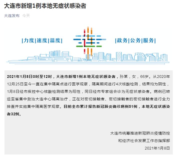 中国网1月8日讯 据大连市人民政府新闻办公室微信公众号消息,大连市统筹推进新冠肺炎疫情防控和经济社会发展工作总指挥部8日发布消息称,1月8日0时至12时,大连市新增1例本地无症状感染者。