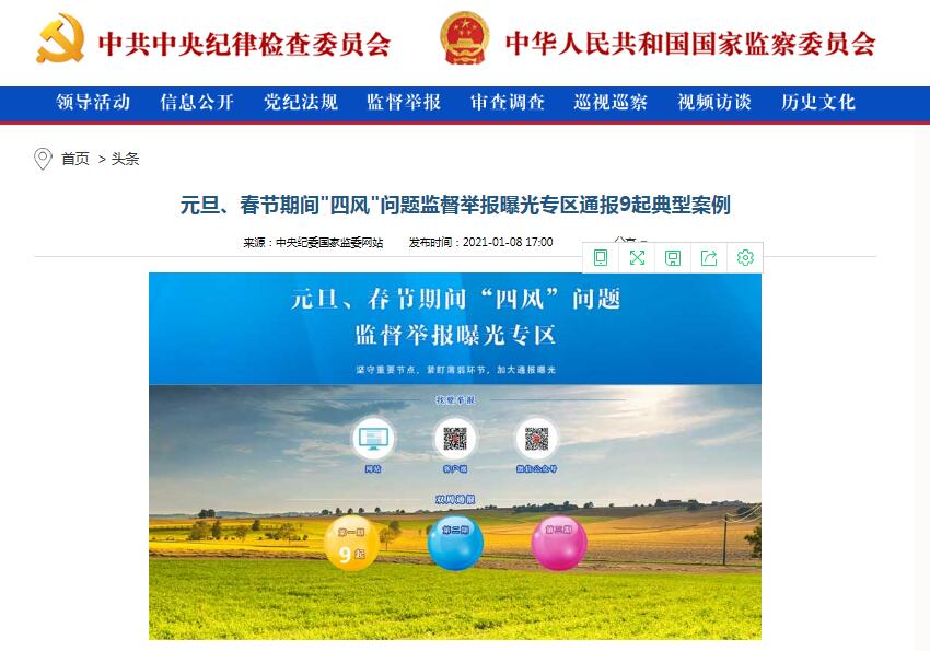 中国网1月8日讯 据中央纪委国家监委网站消息,中央纪委国家监委今日通报元旦、春节期间“四风”问题监督举报曝光专区通报9起典型案例。
