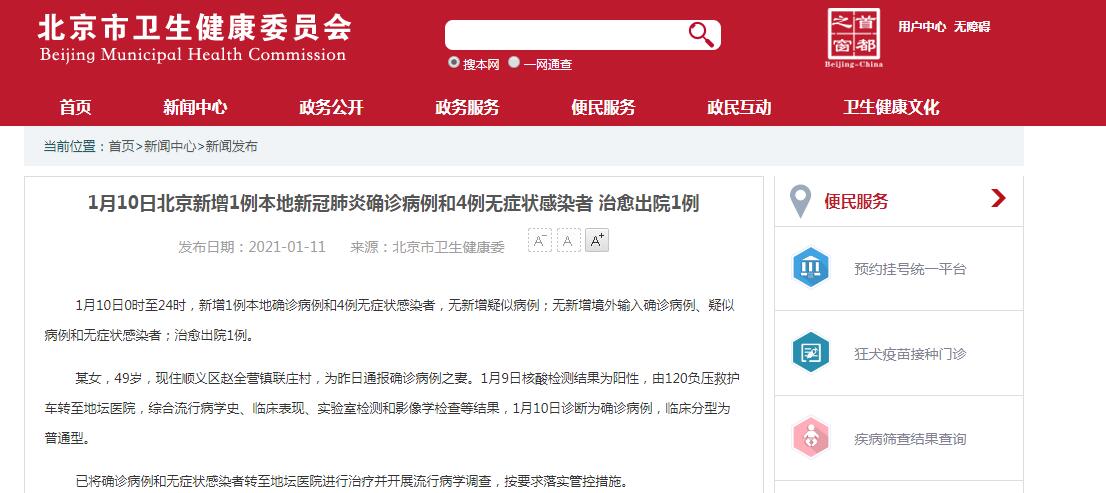 中国网1月11日讯 据北京市卫生健康委员会网站消息,1月10日0时至24时,新增1例本地确诊病例和4例无症状感染者,无新增疑似病例;无新增境外输入确诊病例、疑似病例和无症状感染者;治愈出院1例。