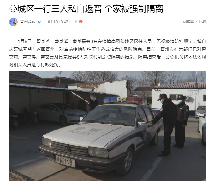 中国网1月11日讯 据河北省石家庄晋州市宣传部官方微博昨日消息,1月9日,翟某燕、曹某溪、曹某嘉等3名在疫情高风险地区居住人员,无视疫情防控规定,私自从藁城区驾车返回晋州,对当前疫情防控工作造成较大的风险隐患。目前,晋州市有关部门已对翟某燕、曹某溪、曹某嘉及其家属共8人采取强制定点隔离的措施。隔离结束后,公安机关将依法依规对相关人员进行行政处罚。