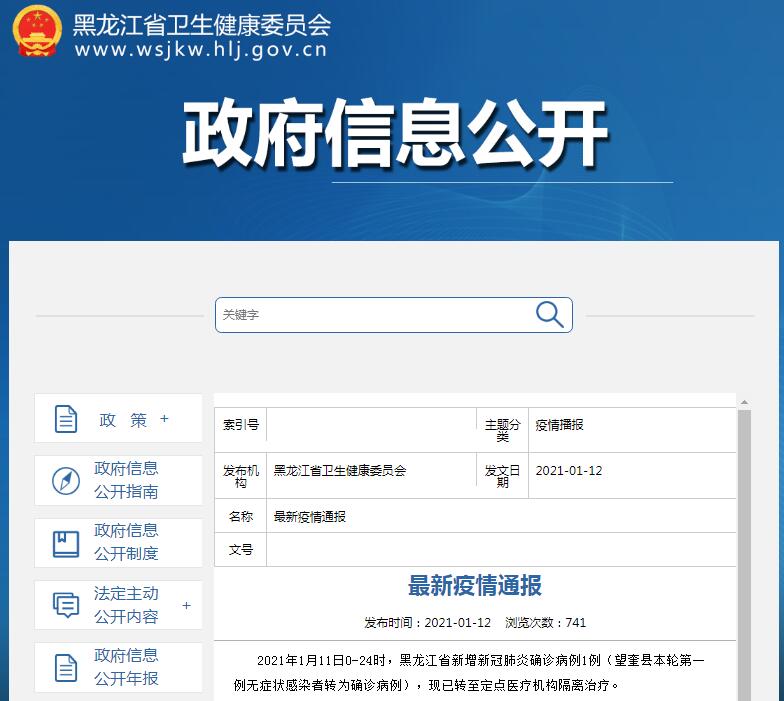 中国网1月12日讯 据黑龙江省卫生健康委员会网站消息,2021年1月11日0-24时,黑龙江省新增新冠肺炎确诊病例1例(望奎县本轮第一例无症状感染者转为确诊病例),现已转至定点医疗机构隔离治疗。