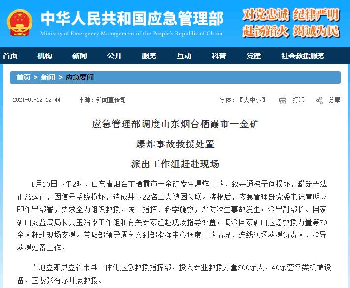 中国网1月12日讯 据应急管理部网站今日消息,1月10日下午2时,山东省烟台市栖霞市一金矿发生爆炸事故,致井通梯子间损坏,罐笼无法正常运行,因信号系统损坏,造成井下22名工人被困失联。接报后,应急管理部党委书记黄明立即作出部署,要求全力组织救援,统一指挥、科学施救,严防次生事故发生;派出副部长、国家矿山安监局局长黄玉治率工作组和有关专家赶赴现场指导处置;调派国家矿山应急救援力量等70余人赶赴现场支援。带班部领导周学文到部指挥中心调度事故情况,连线现场救援负责人,指导救援处置工作。
