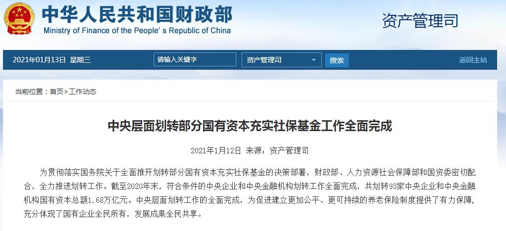 截至2020年末,符合条件的中央企业和中央金融机构划转工作全面完成,共划转93家中央企业和中央金融机构国有资本总额1.68万亿元。中央层面划转工作的全面完成,为促进建立更加公平、更可持续的养老保险制度提供了有力保障,充分体现了国有企业全民所有,发展成果全民共享。