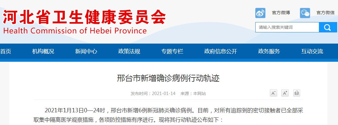 中国网1月14日讯 据河北省卫生健康委员会网站消息,2021年1月13日0—24时,邢台市新增6例新冠肺炎确诊病例。目前,对所有追踪到的密切接触者已全部采取集中隔离医学观察措施,各项防控措施有序进行。