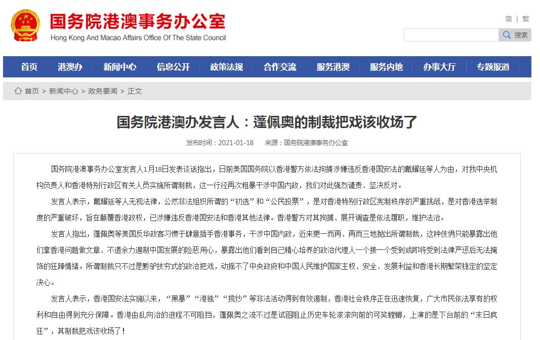 中国网1月18日讯 据国务院港澳事务办公室网站消息,国务院港澳事务办公室发言人1月18日发表谈话指出,日前美国国务院以香港警方依法拘捕涉嫌违反香港国安法的戴耀廷等人为由,对我中央机构负责人和香港特别行政区有关人员实施所谓制裁,这一行径再次粗暴干涉中国内政,我们对此强烈谴责、坚决反对。