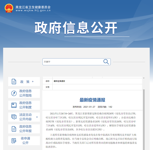 中国网1月27日讯 据黑龙江省卫健委网站消息,2021年1月26日0-24时,黑龙江省新增新冠肺炎确诊病例29例(绥化市望奎县17例,哈尔滨市呼兰区3例,哈尔滨市利民开发区8例,哈尔滨市道外区1例)。治愈出院确诊病例7例(绥化市望奎县)。新增无症状感染者28例(绥化市望奎县20例,哈尔滨市呼兰区4例,哈尔滨市利民开发区3例,哈尔滨市道外区1例)。解除医学观察无症状感染者10例(绥化市望奎县8例,齐齐哈尔市昂昂溪区2例)。
