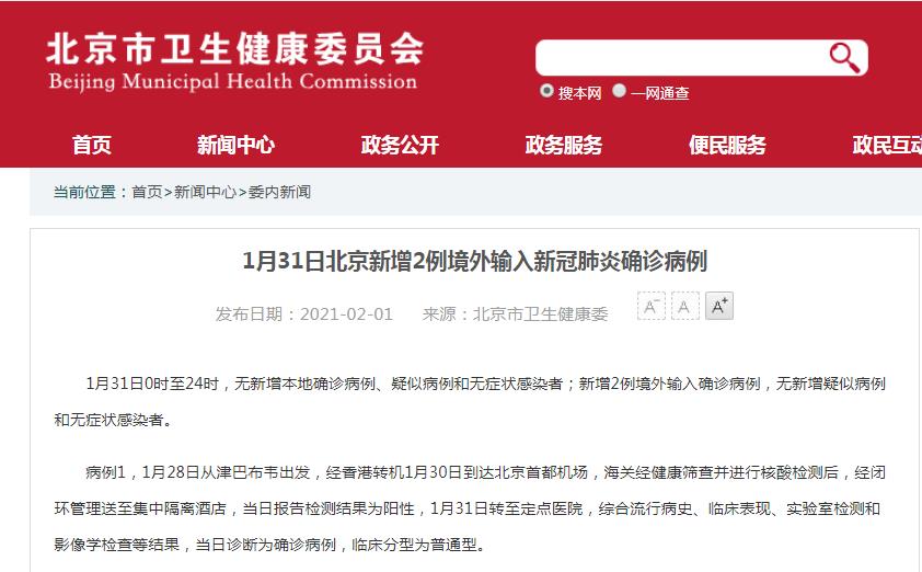中国网2月1日讯 据北京市卫健委网站消息,1月31日0时至24时,北京无新增本地确诊病例、疑似病例和无症状感染者;新增2例境外输入确诊病例,无新增疑似病例和无症状感染者。