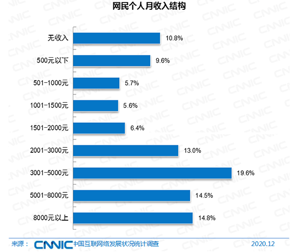 月收入2001-5000元的网民群体占比为32.7%;月收入5000元以上的网民群体占比为29.3%;月收入在3000元及以下的网民群体占比为51.1%;有收入但月收入在1000元及以下的网民群体占比为15.3%。