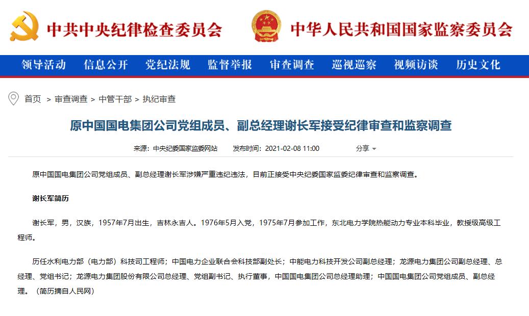 中国网2月8日讯 据中央纪委国家监委网站消息,原中国国电集团公司党组成员、副总经理谢长军涉嫌严重违纪违法,目前正接受中央纪委国家监委纪律审查和监察调查。