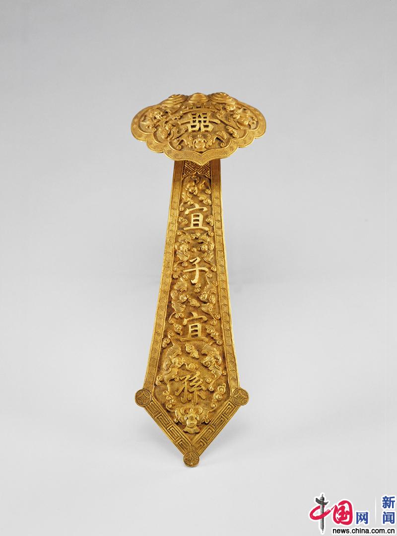 带囍字的如意为婚庆所用。根据清代礼仪,在帝后大婚过程中,皇后乘坐入宫的凤舆时,要手执苹果、金质双喜如意(寓意“平安如意”)。婚后,帝、后觐见母辈太后的朝见礼上,皇后还需首先向太后进呈如意,以示侍奉唯谨;回到乾清宫,皇后需向皇帝呈进如意,皇帝亦回赐皇后如意。可见如意曾出现在清代宫廷婚礼庆典的各个环节,可谓“吉祥先进金如意,天乐声中降凤凰”。 故宫博物院供图