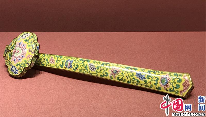 乾隆款画珐琅花卉纹如意 此柄如意柄首背面有蓝色“乾隆年制”楷书款。这件署款的画珐琅如意独一无二,弥足珍贵。