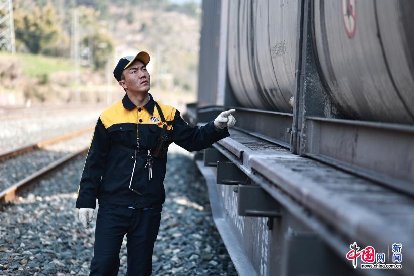 车站连结员格西泽郎正在检查停留车情况。中国网发 苏志刚/摄