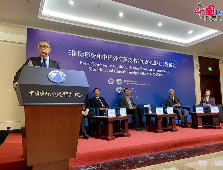 中国网3月12日讯(记者卫芸辉)由中国国际问题研究院(以下简称“国研院”)与世界知识出版社联合举办的《国际形势和中国外交蓝皮书(2020/2021)》(以下简称“蓝皮书”)发布会今日在京举行。国研院院长徐步、上海国际问题研究院院长陈东晓、国研院常务副院长阮宗泽等各领域专家出席发布会。