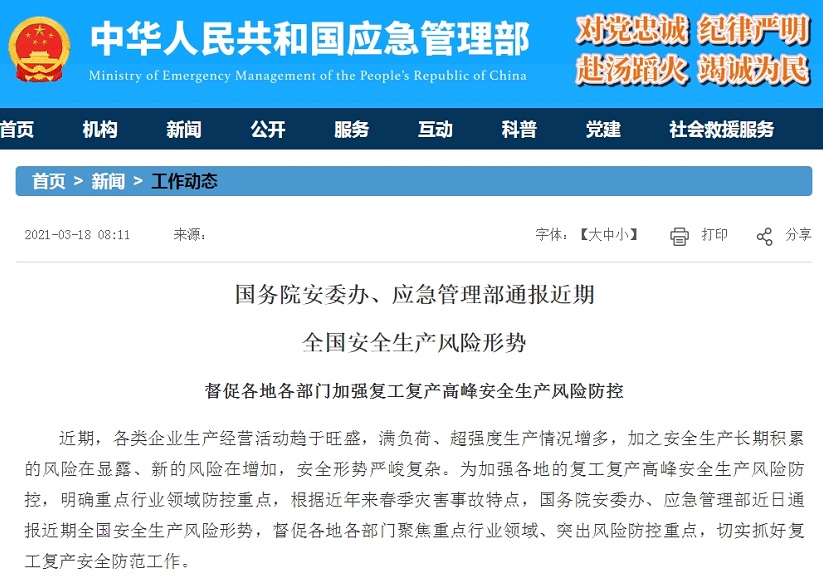 近期,各类企业生产经营活动趋于旺盛,满负荷、超强度生产情况增多,加之安全生产长期积累的风险在显露、新的风险在增加,安全形势严峻复杂。为加强各地的复工复产高峰安全生产风险防控,明确重点行业领域防控重点,根据近年来春季灾害事故特点,国务院安委办、应急管理部近日通报近期全国安全生产风险形势,督促各地各部门聚焦重点行业领域、突出风险防控重点,切实抓好复工复产安全防范工作。
