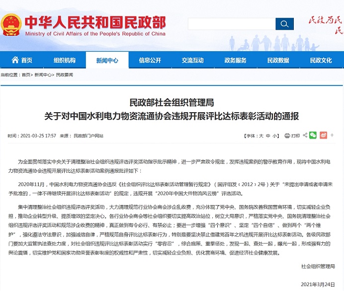 2020年11月,中国水利电力物资流通协会违反《社会组织评比达标表彰活动管理暂行规定》(国评组发﹝2012﹞2号)关于“未提出申请或者申请未予批准的,一律不得继续开展评比达标表彰活动”的规定,违规开展“2020年中国大件物流风云榜”评选活动。