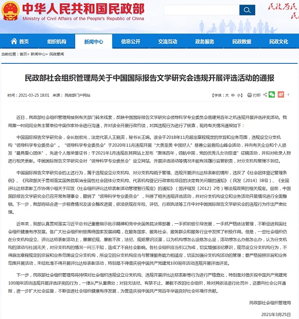 民政部社会组织管理局接到有关部门转来线索,反映中国国际报告文学研究会领导科学专业委员会借建党百年之机违规开展评选评奖活动。民政部社会组织管理局第一时间同业务主管单位中国作家协会进行沟通,并对该会开展行政约谈,对其违规行为进行了核查,具体情况通报如下: