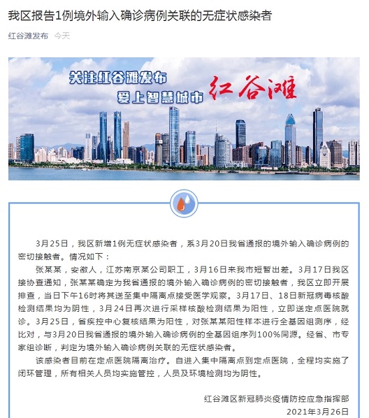 中国网3月26日讯 据江西省南昌市红谷滩区委宣传部微信公众号消息,红谷滩区新冠肺炎疫情防控应急指挥部今日通报,3月25日,该区新增1例无症状感染者,系3月20日江西省通报的境外输入确诊病例的密切接触者。