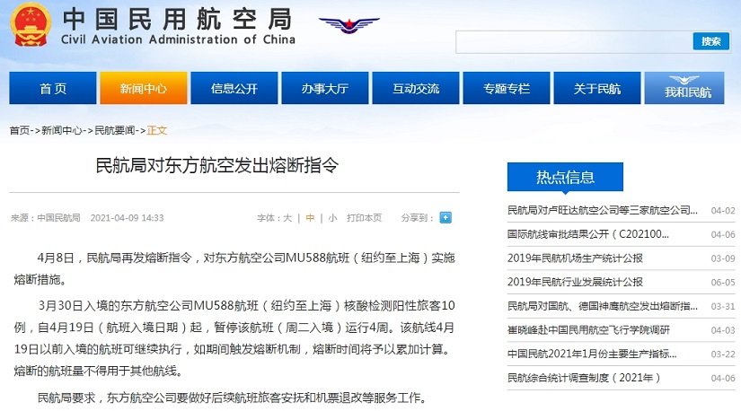 中国网4月9日讯 据中国民用航空局网站消息,4月8日,民航局再发熔断指令,对东方航空公司MU588航班(纽约至上海)实施熔断措施。