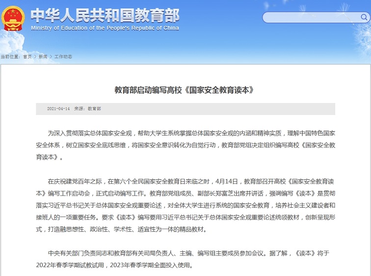在庆祝建党百年之际,在第六个全民国家安全教育日来临之时,4月14日,教育部召开高校《国家安全教育读本》编写工作启动会,正式启动编写工作。教育部党组成员、副部长郑富芝出席并讲话,强调编写《读本》是对全体大学生进行系统的国家安全教育,培养社会主义建设者和接班人的一项重要任务。要求《读本》编写要创新呈现形式,打造融思想性、政治性、学术性、适宜性为一体的精品教材。