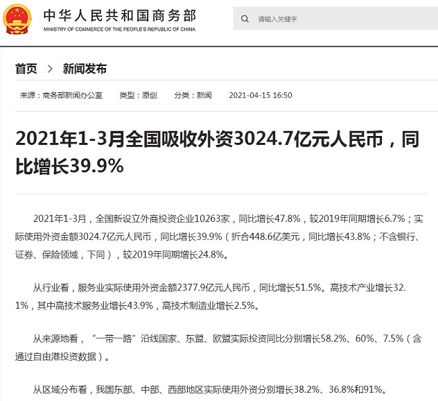 中国网4月16日讯 据商务部网站消息,2021年1-3月,全国新设立外商投资企业10263家,同比增长47.8%,较2019年同期增长6.7%;实际使用外资金额3024.7亿元人民币,同比增长39.9%(折合448.6亿美元,同比增长43.8%;不含银行、证券、保险领域,下同),较2019年同期增长24.8%。