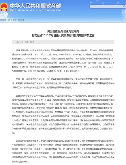 中国网4月21日讯 据教育部网站消息,根据《国务院办公厅关于印发对省级人民政府履行教育职责的评价办法的通知》,2020年,国务院教育督导委员会办公室抽取天津、吉林、浙江、江西、云南、宁夏6个省份,组织开展了实地督查。