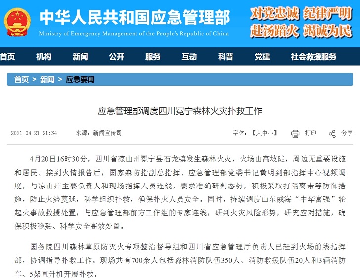 应急管理部网站截图。