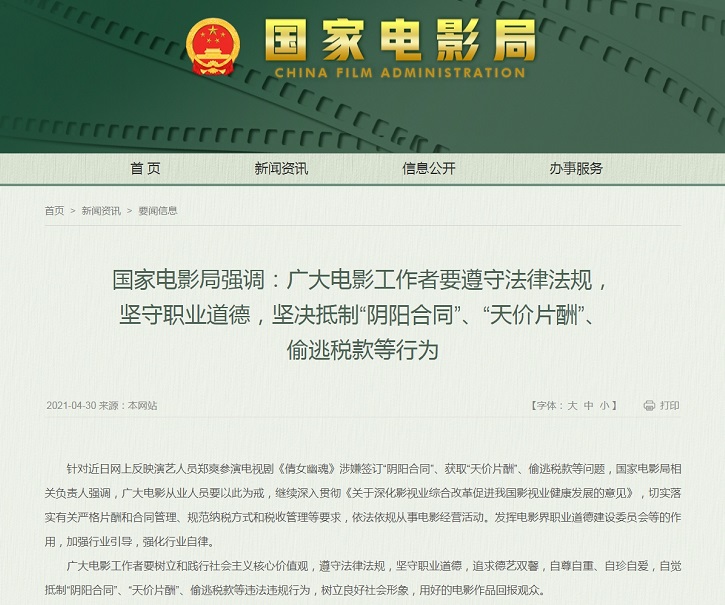 中国网5月1日讯 据国家电影局网站消息,针对近日网上反映演艺人员郑爽参演电视剧《倩女幽魂》涉嫌签订“阴阳合同”、获取“天价片酬”、偷逃税款等问题,国家电影局相关负责人强调,广大电影从业人员要以此为戒,继续深入贯彻《关于深化影视业综合改革促进我国影视业健康发展的意见》,切实落实有关严格片酬和合同管理、规范纳税方式和税收管理等要求,依法依规从事电影经营活动。发挥电影界职业道德建设委员会等的作用,加强行业引导,强化行业自律。