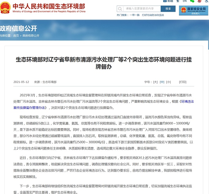中国网5月13日讯 据生态环境部网站12日消息,2021年3月,生态环境部组织松辽流域生态环境监督管理局在所辖流域内开展生态环境日常巡查,发现辽宁省阜新市清源污水处理厂污水溢流、吉林省吉林市磐石市污水处理厂污水溢流等2个突出生态环境问题,严重影响流域生态环境安全,根据《环境违法案件挂牌督办管理办法》,决定对该2个突出生态环境问题进行挂牌督办。
