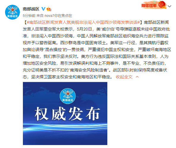 中国网5月20日讯 据中国人民解放军南部战区官方微博今日消息,南部战区新闻发言人田军里空军大校就美舰非法闯入中国西沙领海发表谈话。